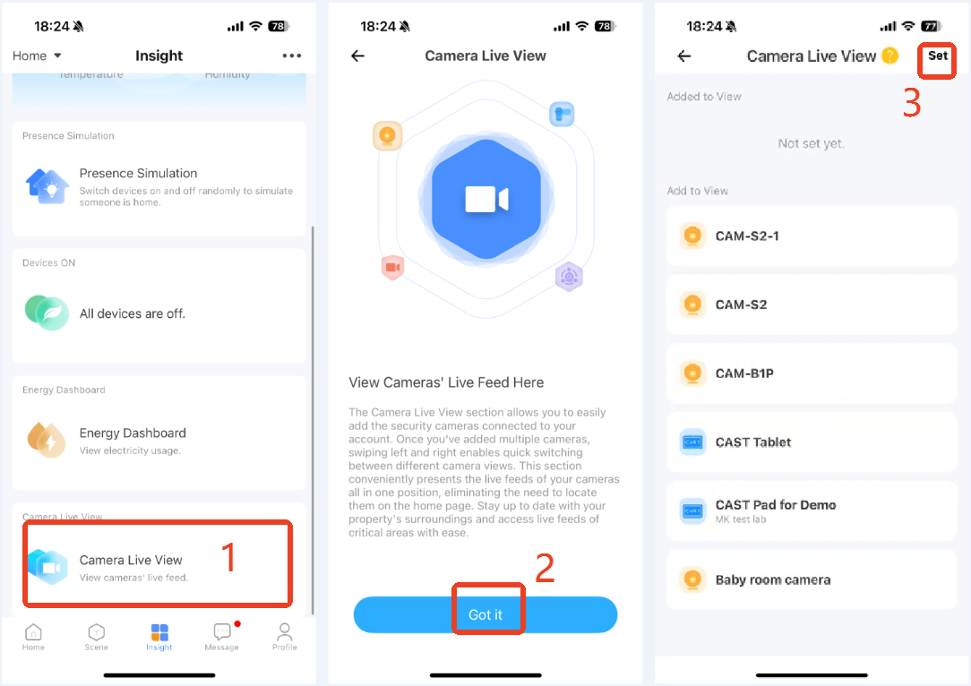 • Instant Live Feeds: View your cameras directly in the Insight -> Camera Live View section. You can effortlessly swipe to view up to 3 different live feeds.